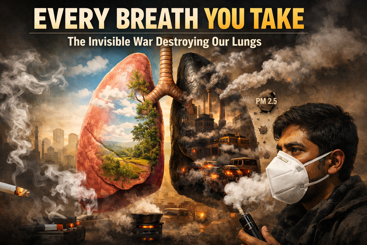 The critical respiratory crisis currently facing India due to escalating air pollution and lifestyle habits. Lung disease is poised to become the nation’s primary cause of death, even non-smokers are developing severe damage equivalent to heavy cigarette use. The systemic dangers of vaping, the often-overlooked risks of passive smoking, and the specific impact of indoor cooking fumes on rural families. Using N95 masks, evaluating air purifiers, and performing breathing exercises to bolster pulmonary resilience. Ultimately, Treat environmental toxicity as a national health emergency while urging individuals to adopt stricter personal health standards.